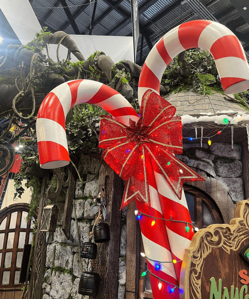 Two oversized, striped candy canes, bright red and white, tied together by a sparkling red bow. They serve as a gateway to a hidden holiday realm, highlighting the festive cheer of Christmas.