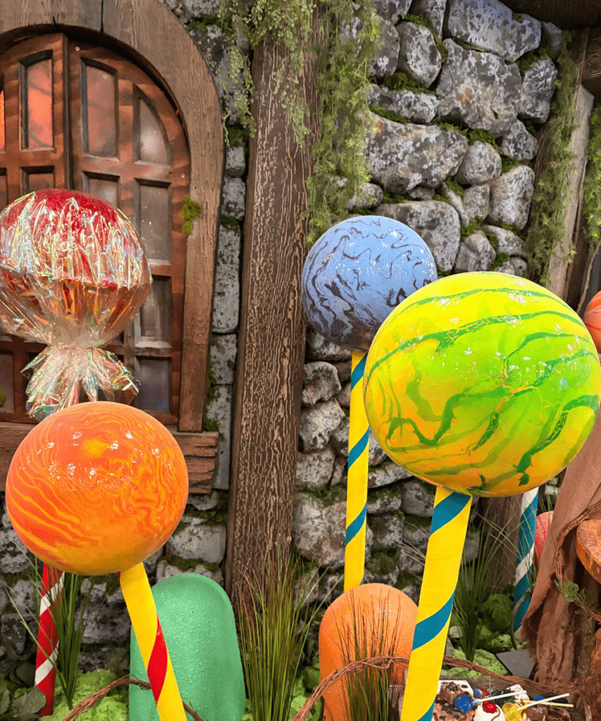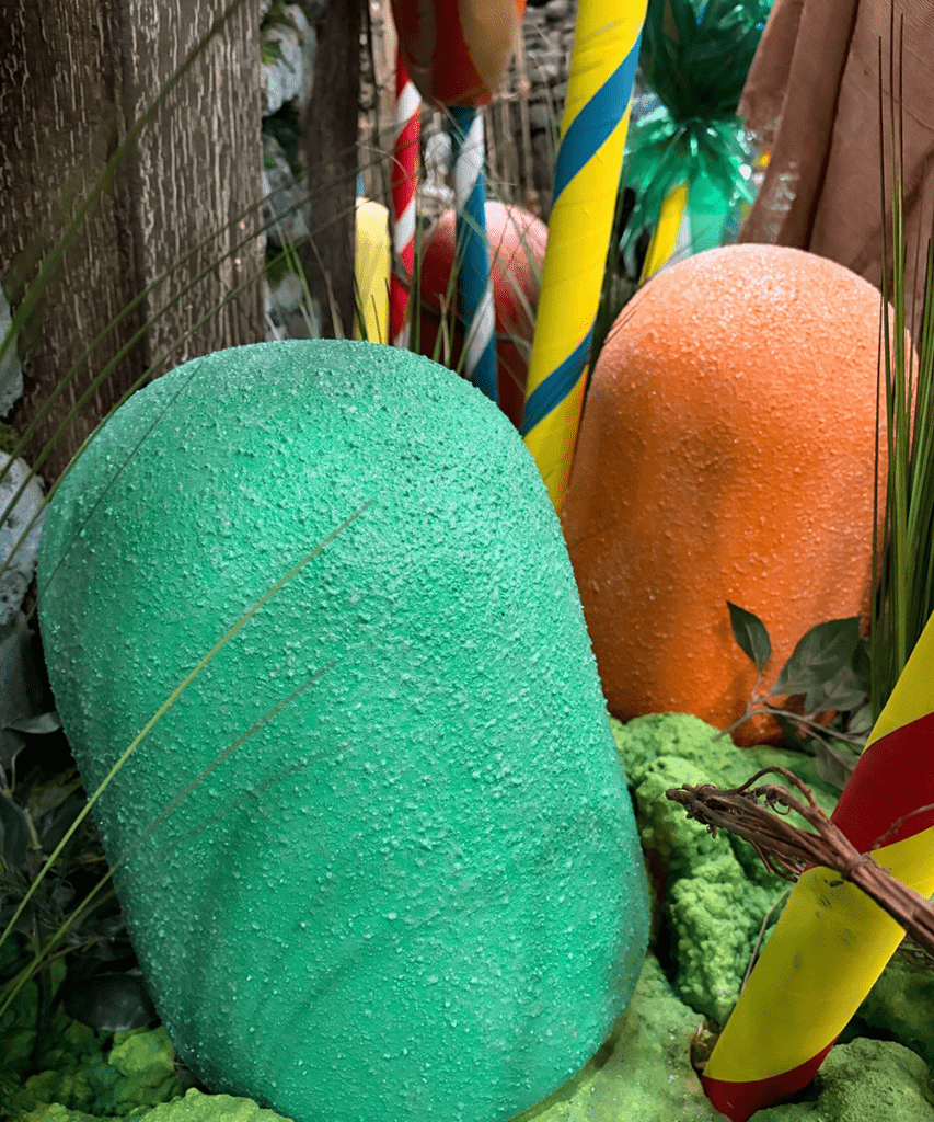 Oversized, sugar-coated gum drops rise in vibrant clusters, their bright colors and playful shapes masking a subtly unnatural presence. Glossy surfaces glisten under the light, inviting guests into a world that feels sweet at first glance…