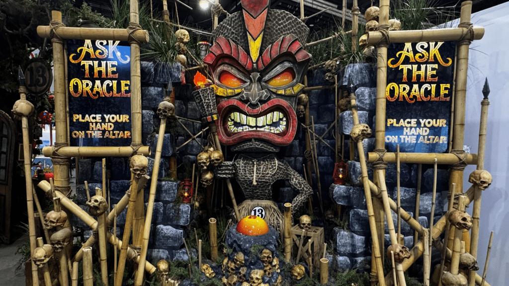 An imposing figure, The Oracle stands tall, daring guests to approach its altar and ask the ancient spirit their fate. This centerpiece is the perfect blend of tropical ambiance and terrifying ritual, captivating visitors with its dark, exotic allure.